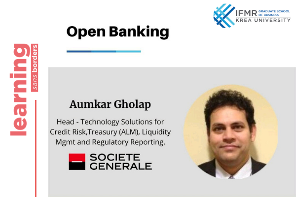 In a highly engaging session, Aumkar Gholap – Head of Technology Solutions for Credit Risk, Treasury (ALM), Liquidity Management and Regulatory Reporting India – interacted with the students at IFMR GSB, Krea University, shedding light on various aspects of ‘Open Banking’. Drawing from his rich experience in the financial sector, he explained how the integration of banking processes and technology have helped secure data. He also his shared insights on the use of open APIs that enable third-party developers to build applications around financial institutions and what it takes to create a long-term sustainable model for the service industry.