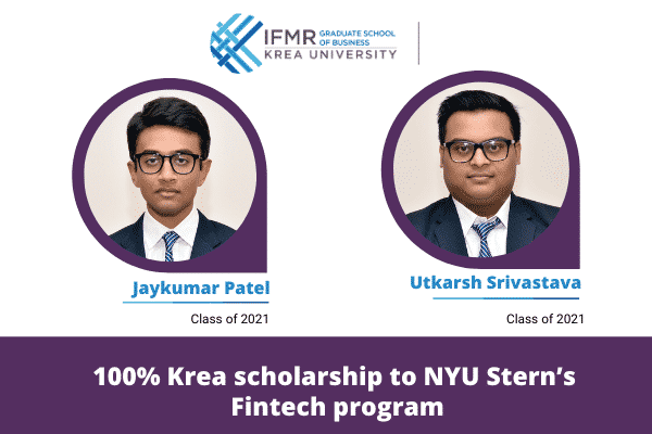 Jaykumar Patel and Utkarsh Srivastava (IFMR Graduate School of Business, MBA class of 2021) are proud recipients of Krea’s 100% scholarship to NYU Stern School of Business’ Fintech program.