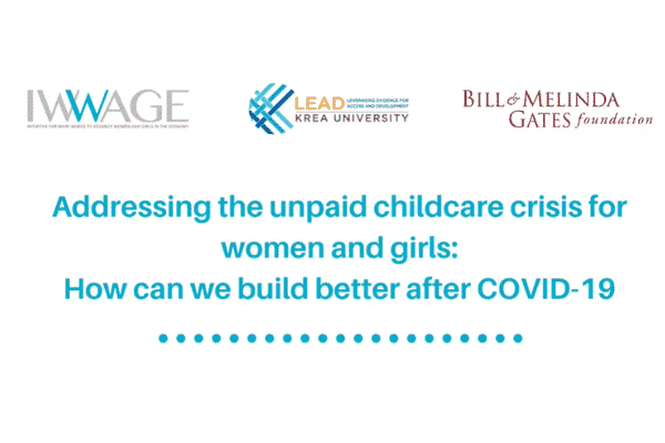 The learning session on ‘Addressing the unpaid childcare crisis for women and girls: How can we build better after COVID-19?’ held in December last year, as part of the learning series started by the Bill & Melinda Gates Foundation, aimed at fostering learning, exchanging ideas and establishing connections across partners working on evidence, advocacy, policies, and interventions related to COVID-19’s social and economic impacts on women and girls. As part of the larger mandate, Bill and Melinda Gates Foundation, the International Development Research Centre (IDRC), and IWWAGE at LEAD are collaborating to undertake an evidence review of the current childcare crisis and the road for post-COVID recovery and resilience. A paper is underway outlining the different pathways in which COVID-19 is impacting women’s care burden, with recommendations for policy solutions and measures that could be explored in different contexts by governments, the private sector, and other key development actors, with a focus on low- and middle-income countries (LMICs).