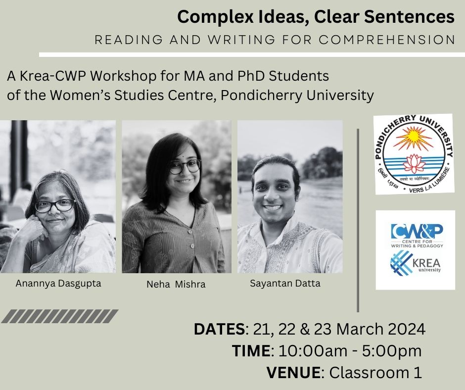 Dr Anannya Dasgupta, Director, Centre for Writing & Pedagogy (CWP) and Associate Professor of Literature, SIAS, Neha Mishra, Assistant Professor of Practice, Centre for Writing and Pedagogy (CWP), and Sayantan Datta, Assistant Professor of Practice, Centre for Writing and Pedagogy (CWP) will deliver a Krea-CWP Workshop for MA and PhD students of the Centre for Women’s Studies, School of Social Sciences and International Studies, Pondicherry University. The workshop titled Complex Ideas, Clear Sentences: Reading and Writing for Comprehension will take place on 21–23 March, 2024.