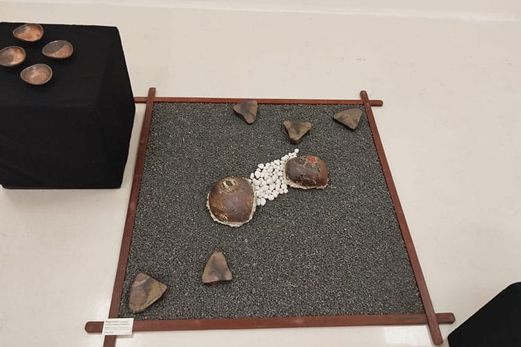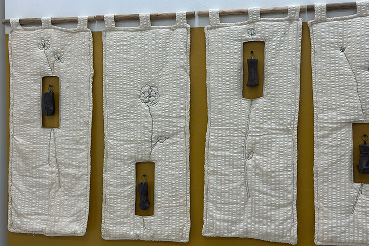 The show has a collection of ceramics ranging from sculptural installations to functional cups and plates, as well as some mini ceramic vases framed by quilted textile panels, also made by Kaveri. There are also watercolour paintings and pencil sketches on display. A set of shelves with 50 ceramic drinking forms on it, is titled “50 Cups”, and beside it is a wall full of pencil and charcoal drawings of 5 faces, titled collectively as “50 Mugs”!