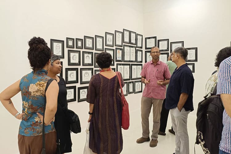 Kaveri Bharath, Visiting Professor, Global Arts, SIAS is showcasing a solo show, Fifty-50, which opened on the evening of 8 August, 2025, at Espace 24 (the gallery of the Alliance Francaise of Madras). After a very warm welcome by the Director of the Alliance, and a small cake cutting to commemorate the artist’s birthday, the doors were opened by the artist’s close family. Krea faculty members, Dr Akhila Ramnarayan, Dr Gowhar Fazili, Dr Annu Jalais, Prajwal Parajuly, and Sara Abraham attended the opening too.