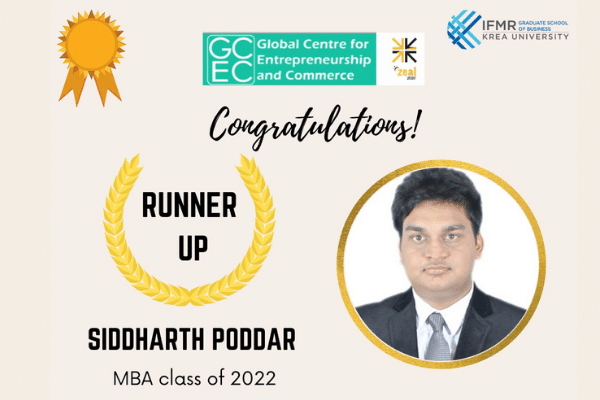 Siddharth Poddar (cohort of 2022) represented IFMR Graduate School of Business, Krea University and secured the first runner-up position in ‘Money Bhai’ as part of Zeal 2020 – a trading competition conducted by the Global Centre for Entrepreneurship and Finance (GCEC).