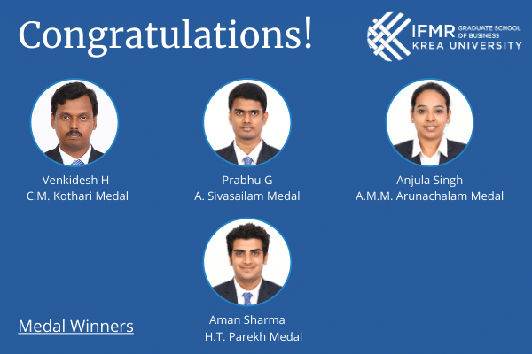 We are delighted to share the list of medal winners and awardees of the Dean’s Merit List at IFMR Graduate School of Business (IFMR GSB), Krea University for the MBA cohort of 2020.