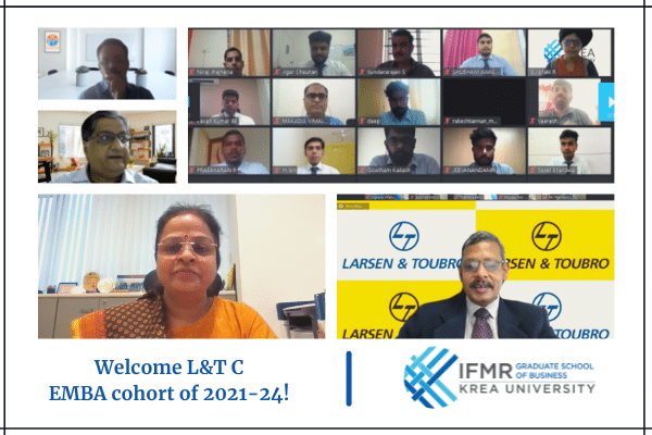 IFMR GSB at Krea University welcomed the new cohort of L&T Executives to the EMBA program 2021-24 on 31 July 2021. The chief guests for the function were Mr Ramkishore, Vice President & Head – Divisional Corporate HR at L&T Construction and Ms Niranjana C, Vice President – Accounts & Administration, Power Transmission & Distribution IC at L&T Construction. The welcome address delivered by Mr Ramkumar Ramamoorthy, Pro Vice-Chancellor for Professional Learning, focused on the programme and how it would help EMBA executives decipher situational trends and proactively address the challenges coming their way.