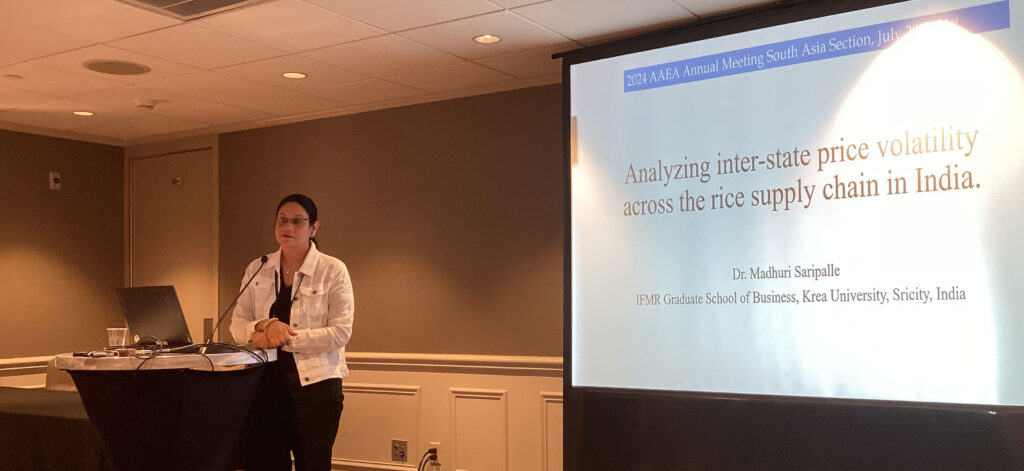 Professor Madhuri Saripalle, Professor, Economics & Chairperson – MBA Programme, IFMR GSB, Krea University presented a paper on Analyzing Inter-State Price Volatility Across the Rice Supply Chain at the American Agricultural Economics Association’s annual meeting (AAEA) held in New Orleans, US, from 28–31 July, 2024. The AAEA meeting is a prestigious conference and attracts more than 1,000 agricultural and applied economists from around the world every year.