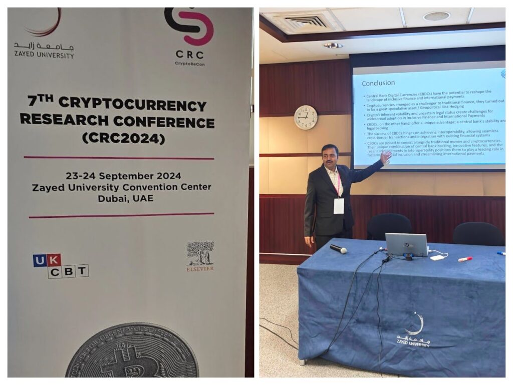 Professor Srinivasan Kalyanasundaram, Professor of Practice in Finance, IFMR GSB, Krea University attended the Cryptocurrency Research Conference 2024 (CRC 2024) at Zayed University in Dubai and presented a paper titled Role of CBDCs in Shaping International Payments and Promoting Inclusive Finance. He co-authored it with Sanjana Mattaparthi, an SIAS student. His paper presentation was well received with interactive questions and answers at the conference. The conference was attended by experts in Cryptocurrency and Blockchain.