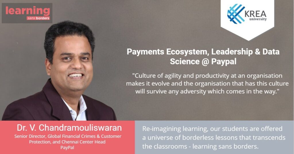 May 30, 2020: In an insightful session, Dr. V. Chandramouliswaran spoke to the students at IFMR GSB, Krea University and punctuated the interaction with lessons from his decade long journey at PayPal.
