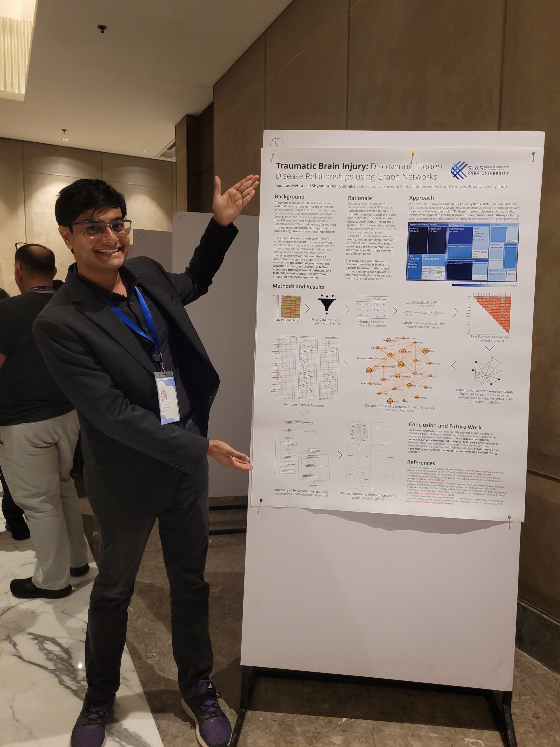 Kaustav Mehta, Teaching Fellow, Dats Science, SIAS recently presented a poster at NetsciX 2025, IIT Indore. This work stems from Kaustav’s third year undergraduate capstone project at Krea University, conducted under the supervision of Dr Shyam Kumar Sudhakar, Assistant Professor, Biological Sciences, SIAS. Their research, titled Exploring Comorbidity Networks in Mild Traumatic Brain Injury Subjects through Graph Theory: A Traumatic Brain Injury Model Systems Study, has been developed into a journal paper and poster. The paper is currently under editorial review.