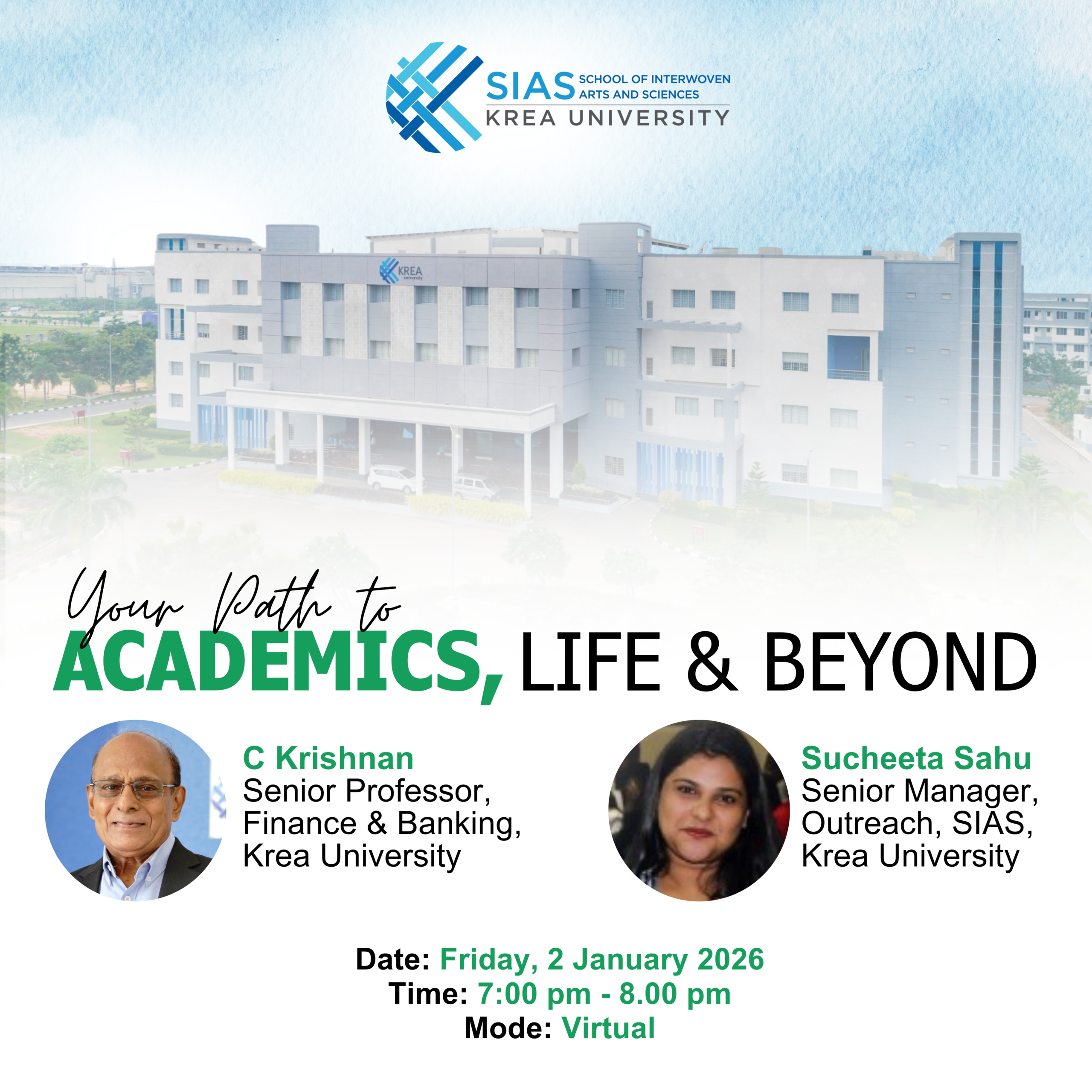 The session will feature insights from senior faculty member and the admissions team. Ask questions, address your concerns, and get a clear overview of what awaits you at SIAS, Krea University.