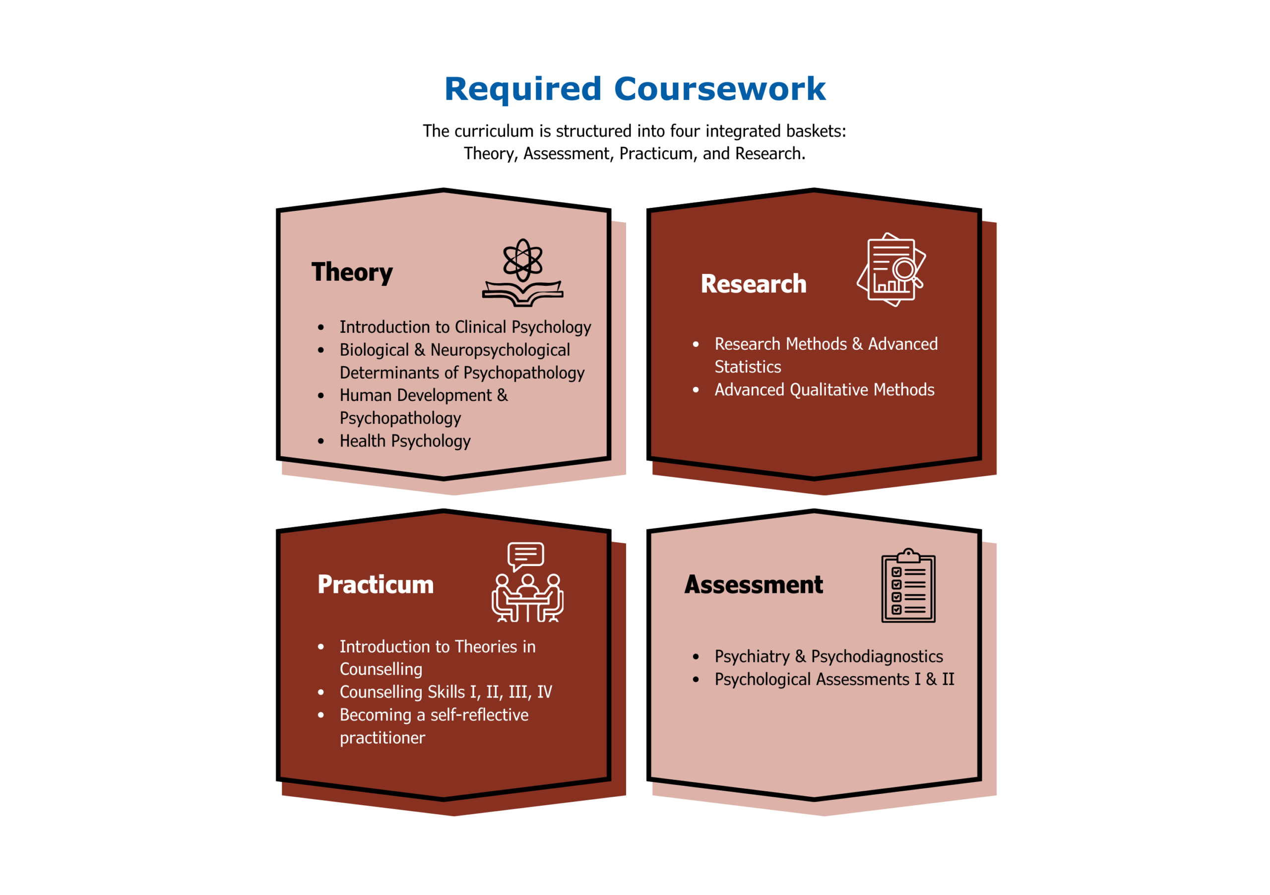 Coursework (16 courses across 4 baskets: Theory, Assessment, Research, Practicum/Lab) |