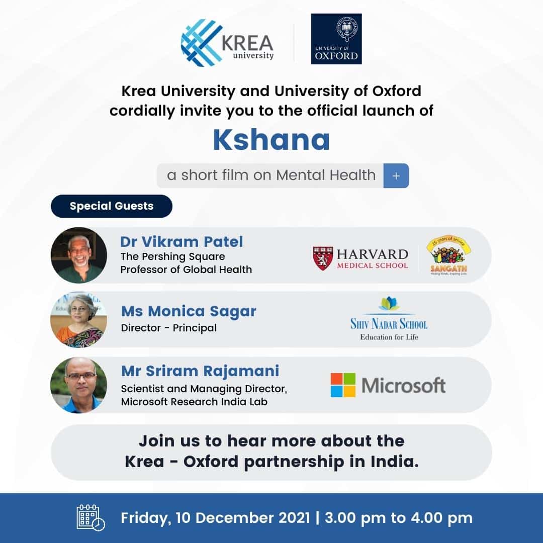 Krea University and University of Oxford are delighted to invite you to this collaborative event with University of Oxford. Over the past year, LEAD at Krea and IndOx have been working on significant impact activities under this partnership, focused on the theme of Mental Health. We conclude this year with the launch of a short film, fully funded by the initiative.